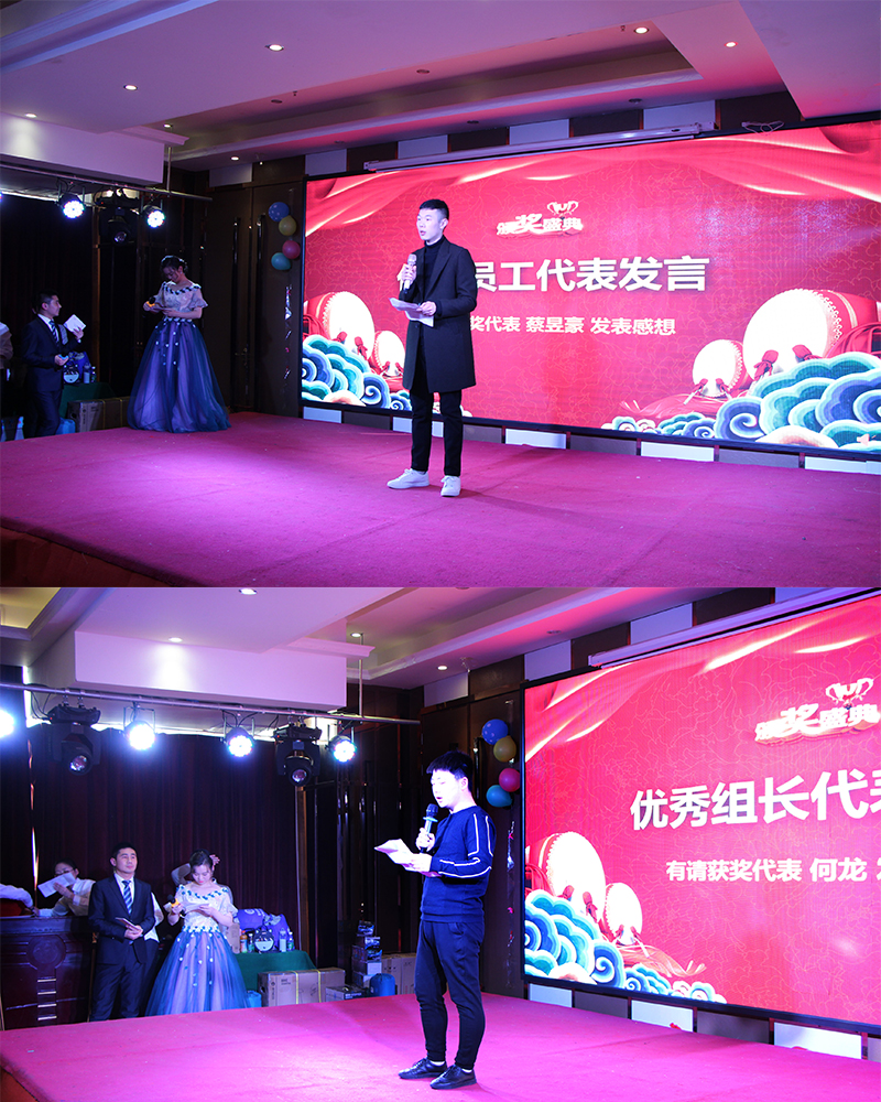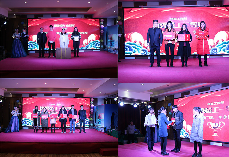 (圖4:頒獎現場剪影) 年度頒獎和文藝匯演環節,主持人邀請了公司各位高層領導和特別嘉賓,向2017年年度榮獲獎項的檔案工程部數字化部2 個優秀團隊、3名優秀組長和12名優秀員工,以及公司本部2個優秀團隊,頒發了榮譽證書和獎金,并合影留念。優秀員工代表蔡昱豪和優秀組長代表何龍分別發表了自己的獲獎感言,全場喝彩聲不斷,為年會的喜悅氣氛再添幾道剪影。