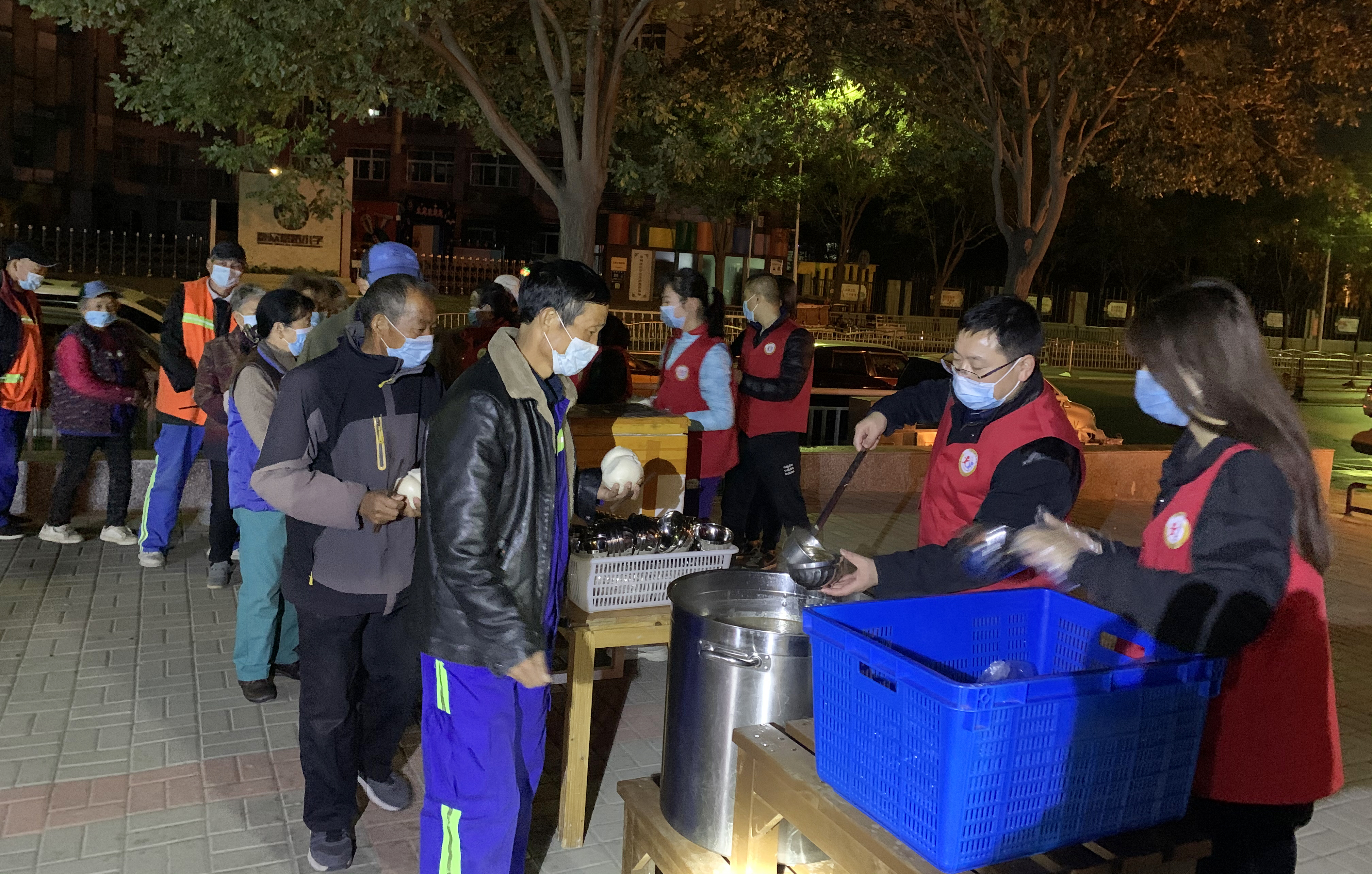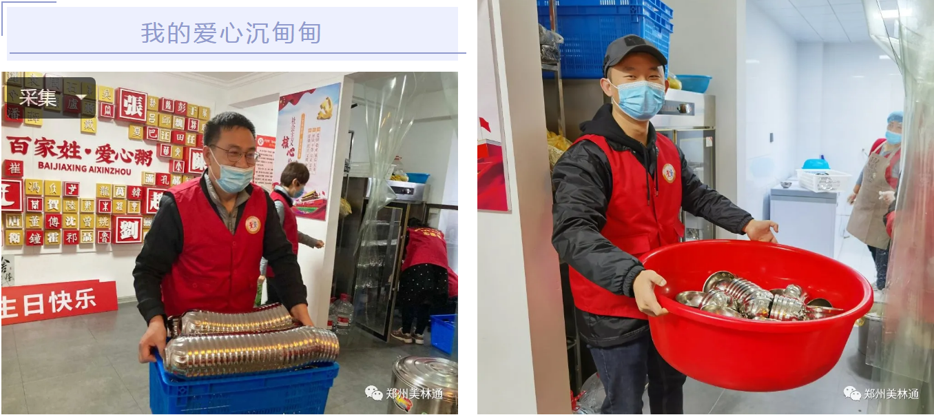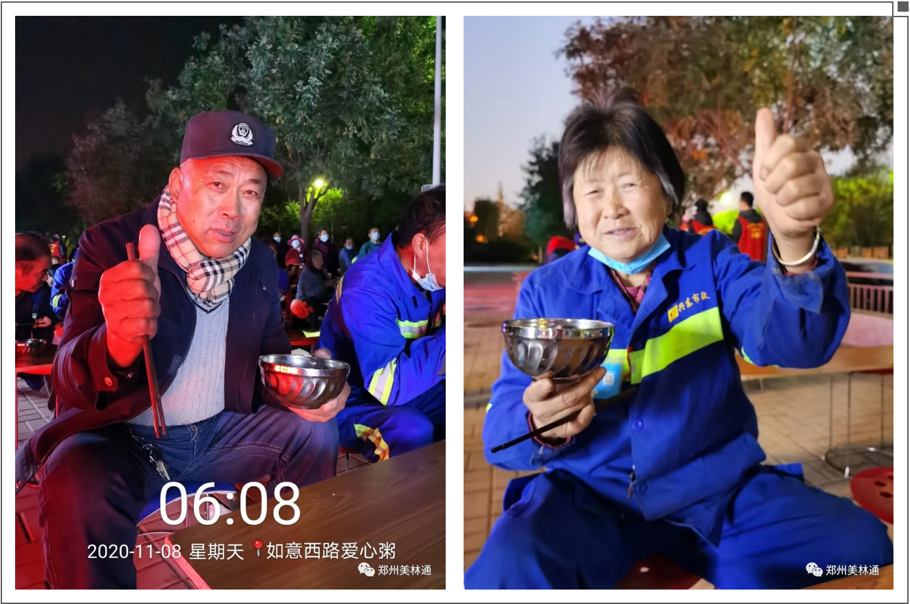 借著晨曦的微光,一個個精神抖擻的志愿者從愛心粥屋里有序地搬出桌椅、擺好碗筷,把一桶桶、一筐筐熱氣騰騰的食物分門別類擺放整齊,笑意盈盈地為每一位來客奉上一份愛心早餐。 ▲美林通志愿團隊隊長張學現為就餐人員打飯