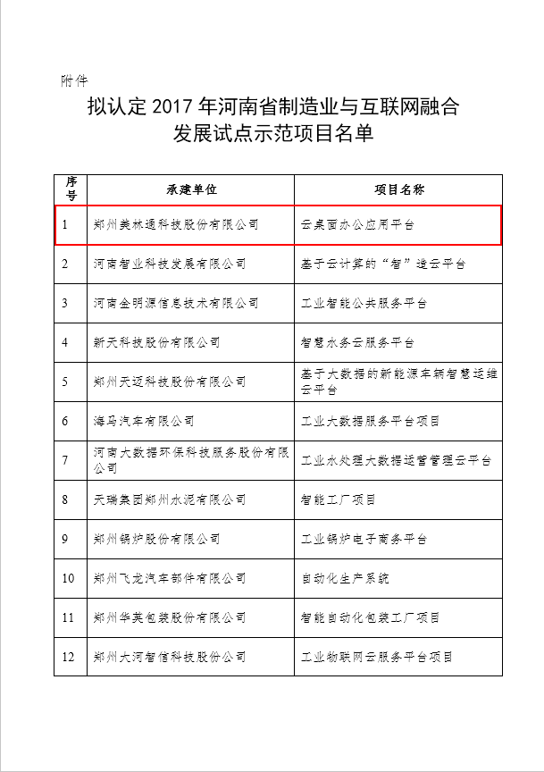 2017年河南省工業和信息化委員會開展的關于國家和省級制造業與互聯網融合發展試點示范申報工作已落下帷幕,我公司的“云桌面辦公應用平臺”被認定為2017年河南省制造業與互聯網融合發展試點示范項目。