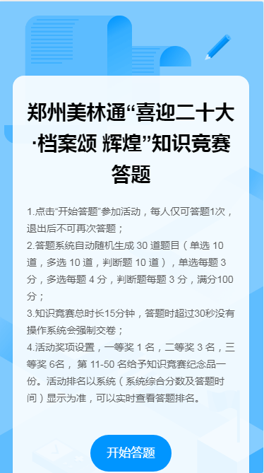 為深入學習貫徹習近平總書記關于檔案工作重要指示批示精神,貫徹宣傳和實施檔案法,充分發揮檔案的社會教育功能,結合第十五個“6.9”國際檔案日、以“喜迎二十大·檔案頌輝煌”為主題的宣傳活動安排,鄭州美林通于6月9日組織開展知識競賽答題活動。本次競賽題目范圍為新修訂的《中華人民共和國檔案法》、《人民法院訴訟檔案管理辦法》、《人民檢察院檔案管理辦法》及黨史等。 ![]() ![]() ![]()